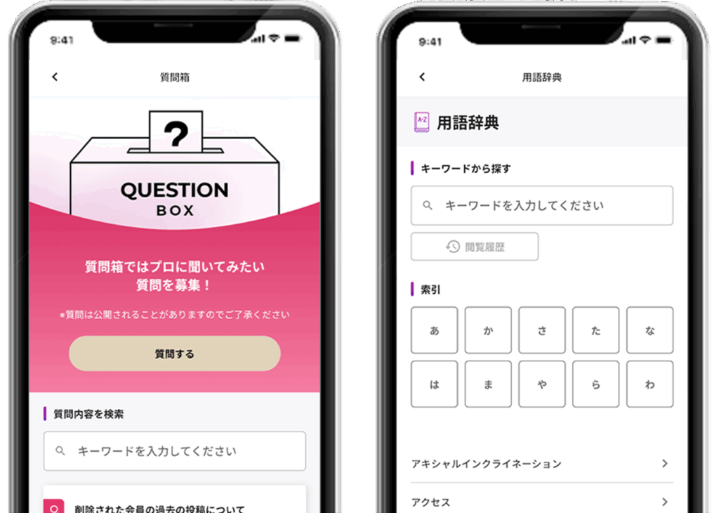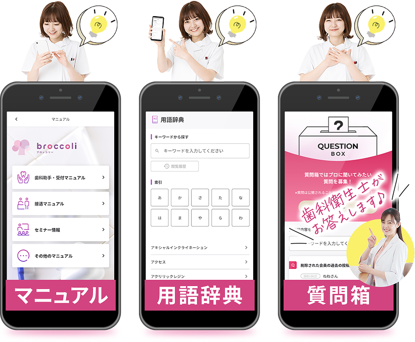 わからないことをその場で解決できる「質問箱」や、移動中に学べる「歯科用語辞典」でスキルアップを後押しします。